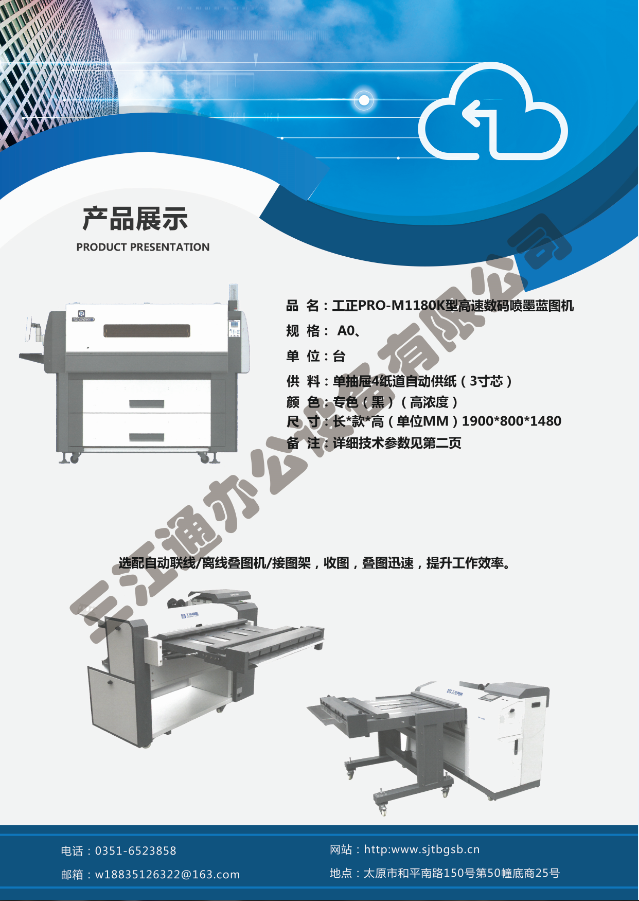 太原市三江通辦公設備有限公司是一家專業從事曬圖機、數碼復印機、多功能打印、復印、掃描、縮放一體機、模擬工程復印機、繪圖儀、大型掃描儀、電子歸檔設備、手動、自動成形圖紙檔案密集柜、圖前圖后設備以及所有制圖設備耗材供應、維修一條龍的實體企業。多年來,已與日本、北京、天津、上海、杭州等諸多家廠方多方合作,成為山西>>更多